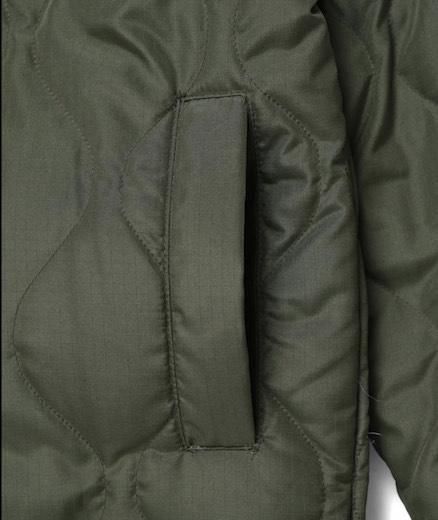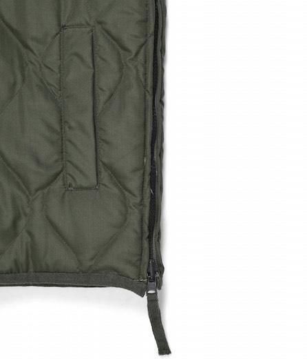 表側には、丈夫なリップストップ生地を使用し、保温性に優れた800FPのダウンを採用、ヘチマキルトのダウンステッチでミリタリー感を演出。